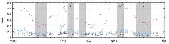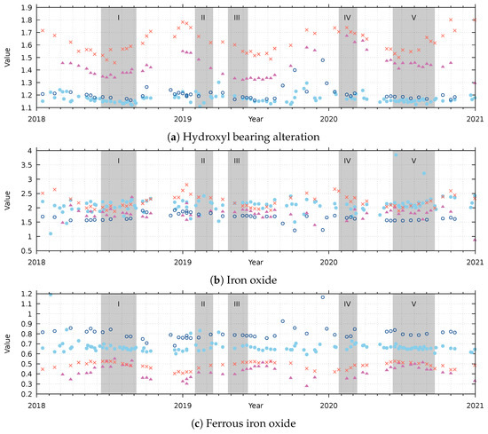The temporal behaviour of the three geological indices after Cudahy [10] is shown in Figure 7. The “ferrous iron index” shown in Figure 7a is, after translating the indices from its original definitions to the Sentinel-2 bands as described above in Table 1, the inverse of the “hydroxyl bearing alteration” index of Sabins [31] shown in Figure 6a but allows a direct comparison to the “ferrous iron index” defined by Sabins [31]. This index therefore also shows an effect of seasonality. The values originating from the quarry area (×) are the lowest and show an annual cycle, with relatively high/low index values in summer/winter. The values for natural vegetation (▲) are higher than for the quarry but lower than for bare soil and beach sand and also show an annual cycle. The index does not show a cyclic behaviour in the bare soil (•) and beach sand (∘) areas, although the index values for these areas do vary throughout the year. Outside of the dry periods, large variations for all four areas can be observed, especially during the autumn of 2019. Within the defined dry periods, the “ferrous iron index” index values seem most stable over the periods I and V compared to the periods II–IV.