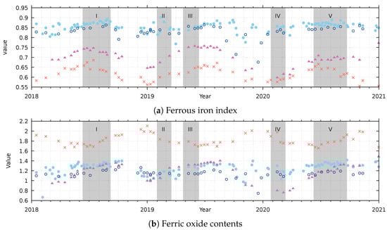 Time series of geological indices (a) Ferrous iron index and (b) Ferric oxide contents, after Cudahy [10]. The data are for (▲) natural vegetation; (•) bare soil; (×) quarry; and (∘) beach sand. The five dry periods longer than 45 days (Table 3) are indicated by a grey-shaded background.