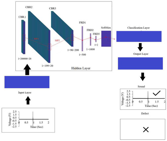 Figure 5 illustrates the architecture of a one-dimensional conventional network successfully developed and implemented to detect delamination in laboratory-created concrete bridge deck specimens [3]. The CBR layers in this figure consisted of three convolution layers, batch normalization, and a rectified linear unit (ReLU). Two max pooling (MP) layers were used in this net to connect the CBR layers. FRD, which is a combination of three fully connected layers, ReLU, drop out, [3] and a SoftMax layer, was also implemented before the output layers to summarize the probability of each class. This figure also indicates the number and kernel size of each layer. The input layer was a one-dimensional matrix (1 × 2,000,000). The value of the IE signals with labels, defect or sound, was moved to the next layers. Batch normalization and the rectified linear unit (ReLU) were also used in the 1DCNN net, which could help increase the training process speed and normalize the active map. The maximum epochs, batch size, and optimization function were 40, 50, and the Adam algorithm, respectively. The detail’s net was the same as in the previous research [2,3].