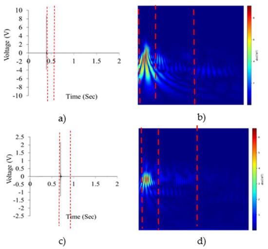 (a) IE signals with defect labels, (b) scalogram for IE with defect labels, (c) IE signals with sound labels, and (d) scalogram for IE signals with sound labels.