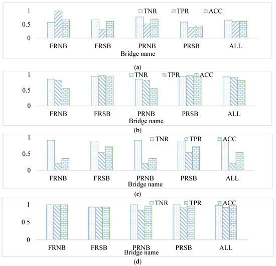 The results of testing the 1DCNN, CNN (TL), CNN (CL), and SVM were used to predict the IE signal labels, illustrated in Figure 8a through 8d, respectively. The results indicated that the proposed SVM based on feature selection had the maximum TPR, TNR, and accuracy rates and provided the most consistency in classification among different bridges. The CNN (TL) performed better than 1DCNN. The CNN models were trained based on time and frequency features extracted from a scalogram; therefore, they benefited from the wavelet transform for predictions. The CNN (CL) did not perform well and had the highest false negative (defect) detections, which was expected since the CNN (CL) demonstrated poor performance in previous studies [2,3] compared to the 1DCNN and CNN (TL).