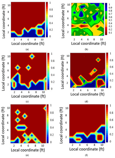 Defects maps were generated for two regions of the Park River South Band bridge to better visualize the results of the IE models investigated in this study. The region with Origin B was selected since it was predominantly defected concrete, as depicted in Figure 9, and the region with Origin A was chosen since it represented a mostly sound concrete, as illustrated in Figure 10. These two origins are also displayed in Figure 1. Ground truth, frequency approach, 1DCNN, CNN (TL), CNN (CL), and SVM were used to generate the defect maps in region B, as illustrated in Figure 9a–f, respectively. Similarly, the results are depicted in the same order for region A in Figure 10a through 10f. The defect maps were generated based on output models.