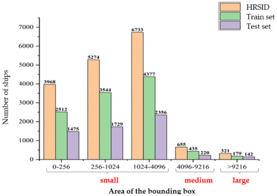 where P represents precision and R represents recall rate. Intersection of union (IoU) is defined as the overlap rate of the predicted bounding box and the ground truth bounding box. AP is the primary challenge metric for the calculation of average IoU, which has ten thresholds distributed from 0.5 to 0.95 with an increment of 0.05. AP50 and AP75 represent the calculation under the IoU threshold of 0.5 and 0.75, respectively. In terms of the capabilities in multi-scale object detection, APS, APM, and APL are used, denoting the precision of objects with small (area < 322 pixels), medium (322 < area < 642 pixels), and large (area > 642 pixels) size. In SAR images, the ships are multi-scale and most of the ships have a small size (Figure 2). Here, we keep APS as the evaluation index.