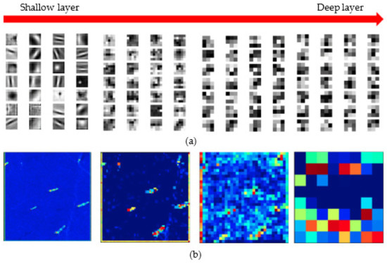 The visualization of feature maps of SAR images. (a) The visualization of feature maps extracted by filters from the backbone network of FPN. The shallow layers include more detailed information such as edges, circles, spots, and so on, while the information shown in the deep layers is more abstract. (b) Visualization of the feature maps of small ships from shallow layers to deep layers. The number of pixels of small ships decreases with the sizes of the feature maps.