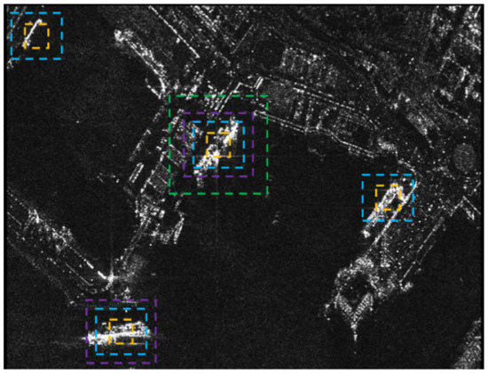 Multi-scale representations are critical for the detection and segmentation of marine ships in SAR images. The dashed boxes of different colors represent the extraction of features at different scales. These multi-scale representations can capture ship size, shape, and the background contexture, which are important information for ship detection and segmentation.