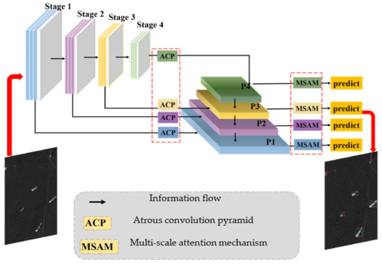 The flow chart of the proposed method. The core idea of this method is to embed ACP and MSAM into FPN, where ACP represents our proposed atrous convolution pyramid, and MSAM represents our proposed multi-scale attention mechanism module. The red dotted box represents our improvement.