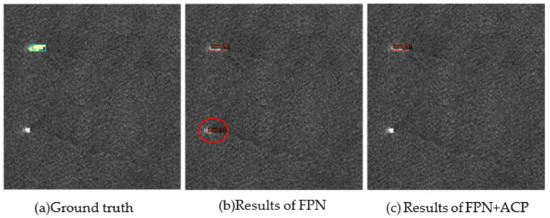 Intuitively, the use of ACP has two merits: (1) the receptive field increases without sacrificing any detailed information, and (2) using three parallel channels can refine low-level feature representations and transfer contextual information from backbone to FPN, which is useful for the detection and segmentation of small ships. These merits of using ACP are illustrated in Figure 7, in which a bright background spot is falsely detected by FPN as a small ship (Figure 7a,b, the red circle), while the FPN model having an ACP module can exclude this false detection (Figure 7c). Using only FPN and deep low-resolution features tends to regard noises similar to ships (possibly islands and reefs) as ships, resulting in false detections. ASPP is another multi-scale feature extraction module that is widely used in the field of computer vision [46], but having a large receptive field is opt to extract background noise features, which is not conducive to small ship detection in SAR images. The proposed ACP module is different from ASPP in two aspects: first, ACP uses convolution operation with lower void ratio, and second, ACP does not have the global pooling method. Therefore, ACP can reduce the false detection of noise in the complex background, resulting in better performance on extracting features of small ships.