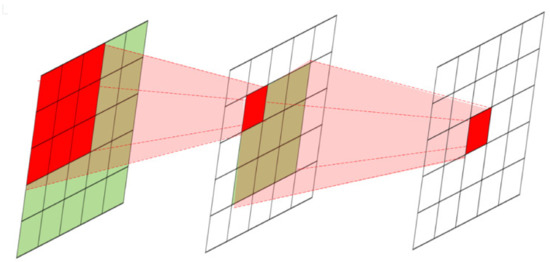 where Cout denotes the number of output channels, Cin denotes the number of input channels, and k denotes the size of the convolution kernel. For the same receptive field, the number of parameters for two 3 × 3 convolutions is much less than that for a 5 × 5 convolution; thus, we can use cascaded 3 × 3 convolutions instead of large convolution kernels to obtain the same receptive field. Similar to two concatenated 3 × 3 convolutions, the receptive field of three concatenated 3 × 3 convolutions is equivalent to the receptive field of a 7 × 7 convolution.