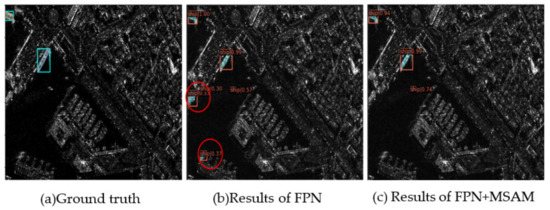 Comparison of performance of FPN and FPN + MSAM. (a) Ground truth. (b) The result of FPN. The red circles indicate the false detection by FPN. (c) The result of FPN + MSAM. In a complex background, FPN falsely recognizes many inshore buildings as ships, which can be avoided by the use of MSAM.