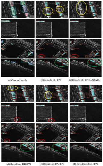 Visually, the proposed MS-FPN model also has the best performance on the SAR HRSID dataset in detecting and segmenting multi-scale marine ships from complex backgrounds, as shown in Figure 12. Compared with the ground truth (Figure 12a), FPN showed some false detections (red circle, Figure 12b), missed detections (yellow circle, Figure 12b), and poor segmentations (green circle, Figure 12b). FPN-CARAFE also showed a reasonable amount of missed detections (yellow circle, Figure 12c). The land clutter was falsely detected as a marine ship (red circle, Figure 12c). Similarly, false detections (red circle, Figure 12d,e), missed detections (yellow circle, Figure 12d,e), and imperfect segmentation (green circle, Figure 12d,e) were presented in the results of the HRFPN model and the PAFPN model. Compared to other models, the proposed MS-FPN model had less false detections and missed detections, and the segmentations were more accurate with a smoother outline (Figure 12f). Only MS-FPN can detect the locations of ships and segment the contours of ships correctly. Therefore, the proposed MS-FPN model has better performance in detecting and segmenting not only the large marine ships, but also small ships surrounded by a complex background. The improved performance of MS-FPN is due to the efficient extraction of shallow-layer feature maps by the ACP module and the fusion of these feature maps by the MSAM module, which can be combined with deep feature maps to achieve a significant improvement.