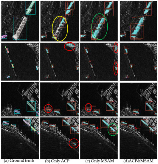 In order to visually compare the effectiveness of each module, we performed the ablation experiment on ACP, MSAM, and ACP&MSAM (Figure 13). Compared with the ground truth (Figure 13a), the model using only ACP showed both false detections (red circle, Figure 13b) and missed detections (yellow circle, Figure 13b). The model using only MSAM showed a reasonable amount of false detections (red circle, Figure 13c) and inaccurate segmentations (green circle, Figure 13c). As shown in Figure 13d, the model having both ACP and MSAM had less false detections and missed detections, and the segmentations were more accurate with a smoother outline. It is also important to note that the model with only the MSAM module can sometimes have better performance on detecting very tiny ships than the model with both the ACP and MSAM modules (see the second line of Figure 13), which indicates that the ACP module could reject the detection of some tiny ships by considering them as background noise (see Figure 7), when using the shallow high-resolution information to detect small ships. Taken together, these results prove that the combination of ACP and MSAM can better utilize the multi-scale feature maps of the network.