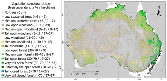 Additionally, a raster layer of vegetation structure over the Australian continent (Figure 2) [] was used to analyse the distribution and magnitude of the unmixing error. This dataset integrated Landsat 5 and 7, Advanced Land Observing Satellite (ALOS) Phased Arrayed L-band Synthetic Aperture Radar (PALSAR) and Ice, Cloud, and land Elevation (ICESat), and Geoscience Laser Altimeter System (GLAS) data, at a spatial resolution of 30 m (matching VFC datasets derived from Landsat imagery). In contrast to other widely used vegetation structure maps of Australia (e.g., The National Vegetation Information System’s Major Vegetation Groups Map), this dataset is spatially continuous and consistent in scale and detail across the entire continent [].