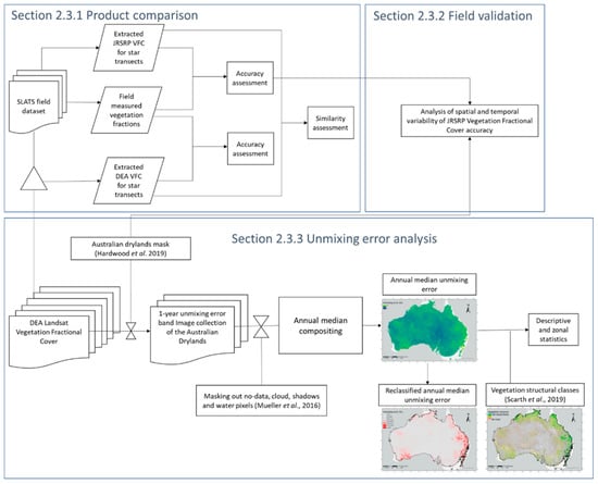 The datasets described above were processed and combined for 3 different analyses (Figure 3). Firstly, JRSRP and DEA VFC products were compared to understand their similarities and differences (Section 2.3.1). Secondly, the SLATS field dataset was employed to explore spatial and temporal properties of JRSRP VFC accuracy (Section 2.3.2). Thirdly, the DEA VFC was employed for exploring the model’s uncertainty across drylands through the unmixing error band (Section 2.3.2).