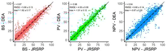 Direct comparisons of JRSRP and DEA estimations showed they were extremely similar for all cover fractions (Figure 3). Modelled cover fractions appear to be highly correlated (r ≥ 0.94), while the difference in estimations were consistently low (RMSE ≤ 6.66) and unbiased (−1.01 ≤ bias ≤ 1.92). The highest correlation and lowest difference between predictions were found for PV, while the opposite is true for NPV. Nonetheless, estimations of the dead fraction showed the lowest bias (−0.87), as DEA predictions tend to be higher than JRSRP for lower NPV values and conversely for high NPV values (evidenced by the slope and origin of linear fit in relation to the 1:1 agreement in Figure 4). Bias for BS (PV) shows values further from 0, as DEA estimations are consistently higher (lower) than those of the JRSRP product.