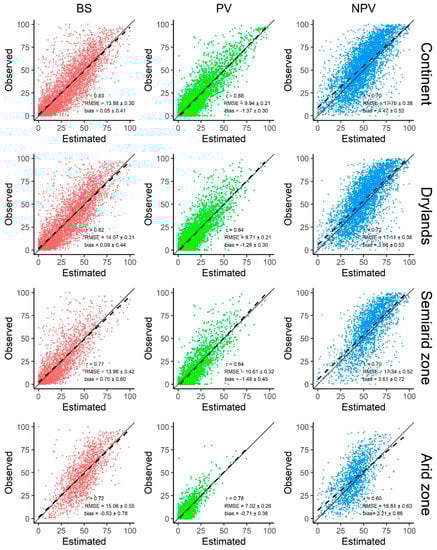 Equivalent validation results were obtained for the continental and continental drylands levels. This is closely related to the fact that over 90% of Australia’s landmass is classified as arid, semi-arid, or subhumid []. Accordingly, the dryland subset of field observations consists of almost 92% of the complete dataset. The most significant change, although subtle, was increased accuracy for the NPV fraction. These results disagree with findings in other dryland regions across the world [,], but concur with previously described [] slightly smaller estimation errors recorded in dry and bright bare (BS > 50%) soils of Australia.