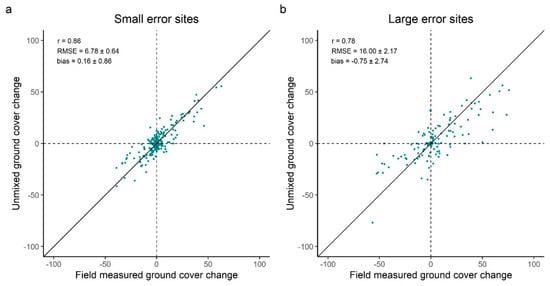 Ground cover change was reasonably estimated for sites with small and large BS estimation errors. For sites where the bare soil fraction was consistently well estimated, observed and satellite derived ground cover change were highly correlated (r = 0.86) and similar (RMSE = 6.76) (Figure 6a). In contrast, locations where high error was detected at least once, displayed substantially higher RMSE (Figure 6b). Nevertheless, these sites also presented a positive and high correlation (r = 0.78) which denotes agreement between measured and estimated ground cover change. In both cases, bias was not significantly different to 0, indicating no systematic under or overestimation of change. Moreover, significant errors in trend detection were found in 15.71% and 17.16% of change observations for small error and large error sites, respectively. This is reflected in the proportion of points in Figure 6a,b falling on quadrats II and IV.
