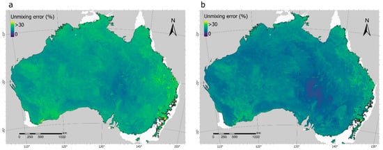 Unmixing error images within drylands of (a) a wet year (2016) and (b) a dry year (2019).