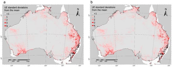 Images of distance to the mean unmixing error measured in standard deviations for (a) a wet year (2016) and (b) a dry year (2019).