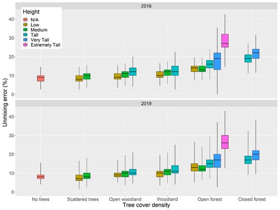 The clustered spatial distribution of relatively high UE values in distinct patches suggests that the model quality may be influenced by non-random characteristics of the surface. UE values tend to be higher near the dryland’s boundary for both years (Figure 8). The spatial distribution of these error patterns matches the distribution of landscapes with high tree cover density (i.e., forests) and over 15 m of height (Figure 2) []. The unmixing error consistently increased in response to shifts in tree density classes (Figure 8). Within each tree cover density class, there is a positive UE response to height class shift. This is particularly evident for the height class shift from “very tall” (mean UE = 18.31%) to “extremely tall” (mean UE = 27.91%) within the “Open Forest” tree cover density class (Figure 9). Moreover, moderate yet significant correlations (p < 0.01) were found between unmixing error and the observed cover fractions (except with NPV). The unmixing error tended to increase with the proportion of green vegetation, and more weakly decrease as the bare soil fraction increased (Figure A3).