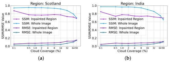 - The sentence in line 257 should read “The inpainting quality appears to be consistent for cloud coverage ratio between 0.1% to 16%, where the inpainted region SSIM is approximately 0.75 for the Scotland and India regions.”