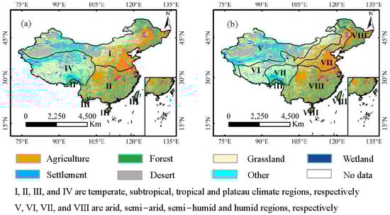 Data for the dominant terrestrial ecosystems including agriculture, forest and grassland ecosystems (Figure 1) was extracted form land cover/land use data of China which was obtained from the Data Center for Resources and Environmental Sciences, Chinese Academy of Sciences (https://www.resdc.cn (accessed on 3 May 2022)). This data was derived from the Landsat images with supervised classification and visual interpretation, and has been widely used to monitor the land use change at regional scale [32].