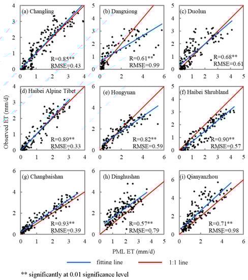 The performance of the PML model for the total ET at 9 flux net sites (Figure 2) showed good agreement between the model estimation and measurements. The R2 varied between 0.57 and 0.93 with the average of 0.77, and the RMSE ranged from 0.33 to 0.99 mm/d with the average of 0.63 mm/d. This suggests a reasonable accuracy of the PML product over China, which is slightly superior to (has a smaller RMSE than) the performance at the global scale (RMSE of 0.69 mm/day [30]). The PML model performed best at the Haibei alpine meadow ecosystem (Figure 2d) with the lowest RMSE of 0.33 mm/day, followed by that at Changbaishan forestry ecosystem (Figure 2g) and Changling grassland ecosystem (Figure 2a), while higher RMSE was observed at Qianyanzhou forestry ecosystem (Figure 2i) and Dangxiong wetland ecosystem (Figure 2b).