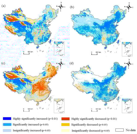 Analysis of the interannual trends of ET components for each pixel across China was conducted using the batch processing script complied by Python. Subsequently, combing the changing rate and the significance of the interannual trends, continental China was reclassified into 6 classes including highly significantly increased (k > 0, p < 0.01), significantly increased (k > 0, 0.01 ≤ p < 0.05), insignificantly increased (k > 0, p ≥ 0.05), highly significantly decreased (k < 0, p < 0.01), significantly decreased (k < 0, 0.01 ≤ p < 0.05), and insignificantly decreased (k < 0, p ≥ 0.05).