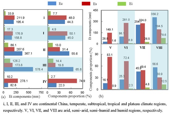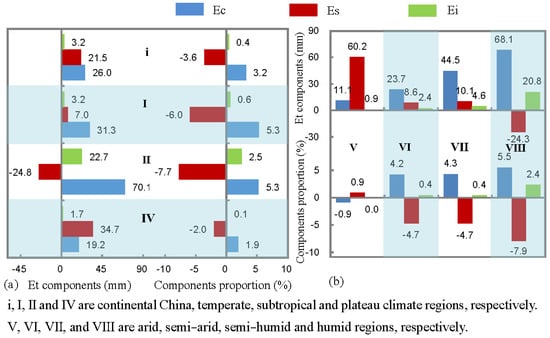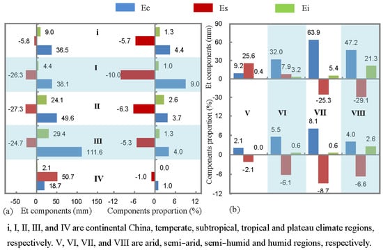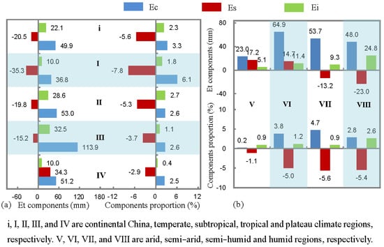 The Ei increased in subtropical and tropical zones and humid regions by more than 20 mm (Figure 5), while its proportion to ET (Ei/ET) increased by only 2.6% in the subtropical zone and humid region and changed little in other climate zones and moisture regions.