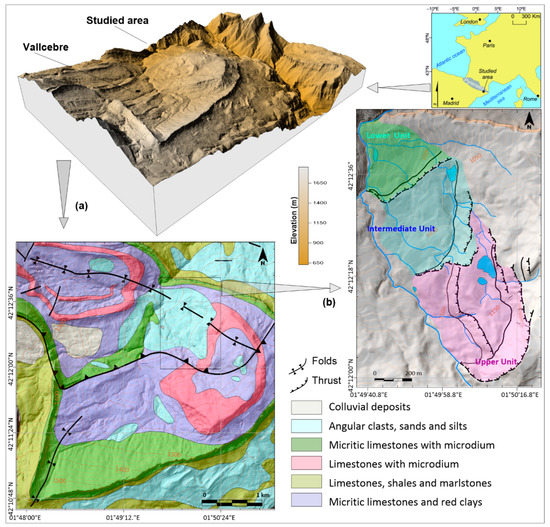 (a) Location sketch and geological map of the studied zone. Modified from [25]; (b) Geomorphological sketch (modified from [21]) and digital elevation model of the Vallcebre landslide obtained using LIDAR data from Catalan Geological Survey [26].