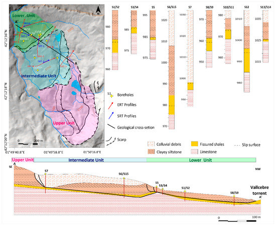 Location of the geophysical surveys and simplified lithological logs of and the geological cross-section A’—A boreholes (Vallcebre area). Modified from [21].
