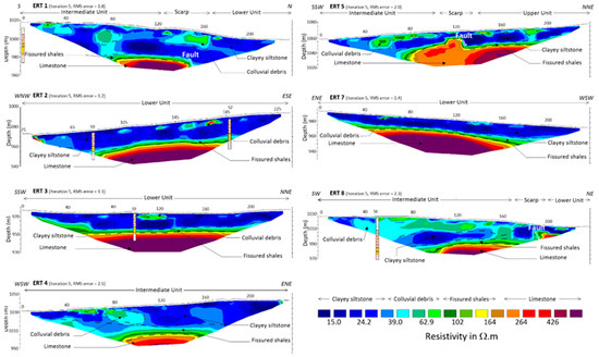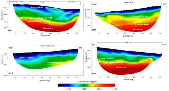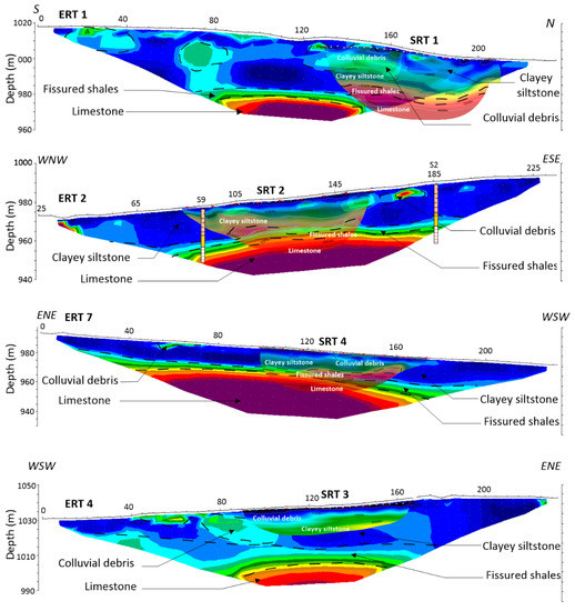 We also compare qualitatively the results obtained from refraction seismic and electrical resistivity campaigns, adding the closest lithological log data in ERT 2-SRT 2 cross-sections, and showing a good fit among them (Figure 6). The values of both seismic P-wave velocity and electrical resistivity that we assigned to limestones and siltstones are analogous to the values reported by the authors of [50,51] in similar settings.