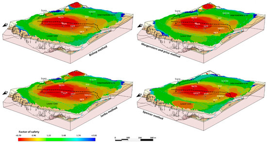 The FS maps also showed fair agreement with [52], who studied the Lower Unit by using the infinite slope theory implemented in a geographic information system (GIS) and considered the landslide as infinite slices, assigning geotechnical parameters (unit weight, angle of friction and cohesion) for each as a rigid block, adding the fracture surface, water level variation, then finally determining the factor of safety to produce the FS map of the Lower Unit. The algorithm used has neglected the interslice forces, the 3D effect, and the fact that the landslide area consists of four formations with different geotechnical parameters. In the current research, the method used is quite different, as stated previously; this explains the differences between FS values in both articles. However, the values of FS were close in general as both methods showed convergence to unity, but there are differences in the location of low FS anomalies.