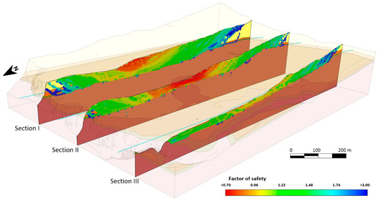Figure 8 shows three geological cross-sections created with Slide3 software. The picture was edited to highlight the variation of FS along the sliding units (above the limestone formation). The sections show that the middle area has a lower factor of safety (fewer than 1), which represents the area between the Intermediate Unit and the Lower Unit. Section II shows the lowest values of FS. Afterward, these sections were exported to Slide2 software for two-dimensional analysis (Figure 9).