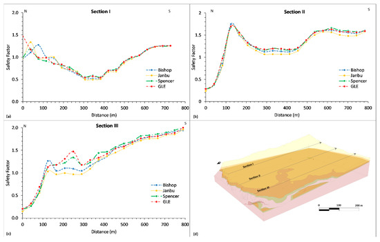 The factor of safety values of Sections I (a), II (b) and III (c) using two-dimensional limit equilibrium methods (Slide2 software). The analysis was performed using Bishop, Janbu, Spencer and GLE; (d) location of Sections I, II and III.