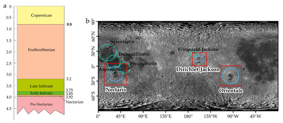- Fassett, C.I.; Head, J.W.; Kadish, S.J.; Mazarico, E.; Neumann, G.A.; Smith, D.E.; Zuber, M.T. Lunar impact basins: Stratigraphy, sequence and ages from superposed impact crater populations measured from Lunar Orbiter Laser Altimeter (LOLA) data. J. Geophys. Res. Planets 2012, 117, E00H06. [Google Scholar] [CrossRef]