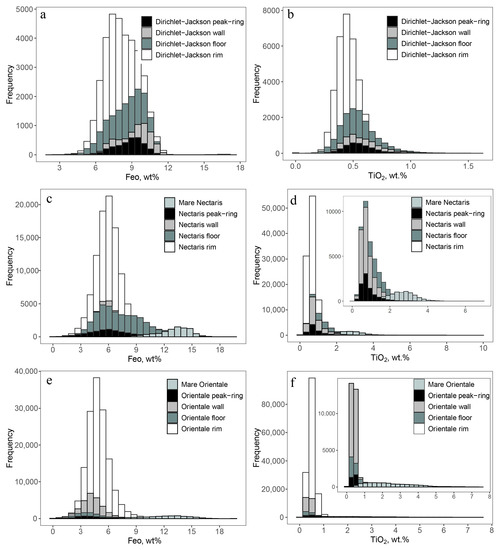 4.3.1. FeO and TiO2 Contents of the Basins