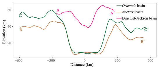 - Miljkovicc, K.; Wieczorek, M.A.; Collins, G.S.; Laneuville, M.; Neumann, G.A.; Melosh, H.J.; Solomon, S.C.; Phillips, R.J.; Smith, D.E.; Zuber, M.T. Asymmetric distribution of lunar impact basins caused by variations in target properties. Science 2013, 342, 724–726. [Google Scholar] [CrossRef] [PubMed]