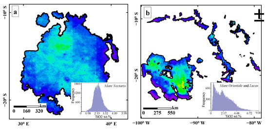 - Giguere, T.A.; Taylor, G.J.; Hawke, B.R.; Lucey, P.G. The titanium contents of lunar mare basalts. Meteorit. Planet. Sci. 2000, 35, 193–200. [Google Scholar] [CrossRef]