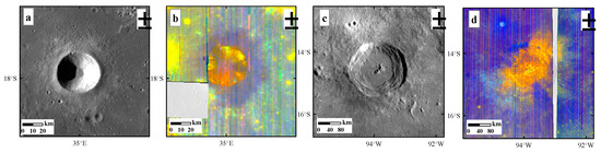 - Bretzfelder, J.M.; Klima, R.L.; Greenhagen, B.T.; Buczkowski, D.L.; Cartwright, S.F.A.; Moriarty, D.P.; Ernst, C.M.; Petro, N.E. Comparative Spectral Analysis of Three Distinct Lunar Basins. In Proceedings of the 50th Lunar and Planetary Science Conference, The Woodlands, TX, USA, 18–22 March 2019. [Google Scholar]