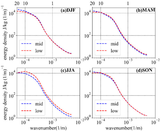 - In different seasons, there are also differences in the spectral distributions at MLs and LLs. In winter, is larger at MLs than at LLs for wavenumbers of 0.05–0.5 km−1. In summer, is larger at LLs than at MLs for wavenumbers of 0.1 to 1 km−1.