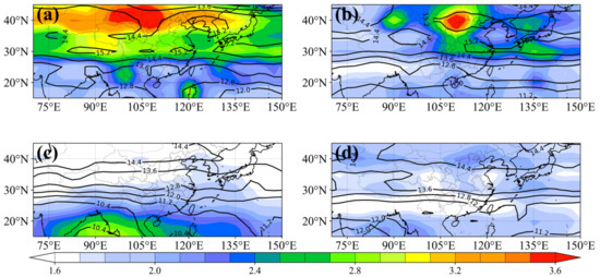 Figure 4 shows the latitude–longitude distribution of the seasonally averaged and values. We define the sum of the mean value and standard deviation of in the four seasons as the reference value, and the region with values larger than the reference value is defined as the large-value region of [18]. In Figure 4, the reference value is 2.59 × 104 J/kg (1/m)−1. It is evident from Figure 4 that exhibits significant seasonal variations. The regional averages of are 2.60 × 104, 2.13 × 104, 1.89 × 104, and 1.84 × 104 J/kg (1/m)−1, and the standard deviations of are 4.9 × 103, 3.3 × 103, 3.7 × 103, and 1.5 × 103 J/kg (1/m)−1 in winter, spring, summer, and autumn, respectively. In the Asian monsoon region, is largest in winter and smaller in summer and autumn. The standard deviation is larger in winter and summer, and smaller in autumn and spring. In general, in the Asian monsoon region, GWs are strongest in winter and weaker in summer and autumn, and the distribution of GWs in winter and summer is quite different, whereas the distribution in spring and autumn is more uniform. The distribution and seasonal variations of and are analyzed in detail below.