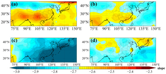 The spectral slope S varies with wavenumber (Figure 1b). To examine the seasonal variations of S, S was calculated by linear fitting over the wavenumber range of 0.1–0.5 km−1 (wavelength = 2–10 km). According to Yan et al. [26] and Lu et al. [27], we set the upper bound to 0.5 km−1. Since is 0.1 km−1 in summer, we set the lower bound to 0.1 km−1 to ensure uniformity across the seasons. Figure 5 shows the distribution of the seasonally averaged S values. S varies from –2.2 to –3.0, which is less steep than the saturation spectrum slope of −3 [6]. S exhibits significant seasonal variations (Figure 5). In winter, the slopes are smaller at MLs and larger at LLs. There are high S value regions over the southern Tibetan Plateau and southern China. This shows that in the northern Asian monsoon region, the energy density shows a greater decrease with increasing wavenumber than in the southern Asian monsoon region. The distribution of S is similar in spring and winter, with smaller S values in the northern Asian monsoon region and larger S values in the southern Asian monsoon region. The distribution of S values in summer is the opposite to that in winter. In the study area in summer, S shows an increasing trend from southeast to northwest, which means that with increasing wavenumber, the energy density decreases more rapidly at LLs, whereas in the western MLs, the energy density decreases more slowly with increasing wavenumber. The distribution of S in autumn is different than that in the other three seasons. Larger S values characterize the mainland of China and the Sea of Japan north of 30°N, which reflect the slow decrease in energy density in this area with increasing wavenumber. In addition, the large value area in the northern part of the Sea of Japan in winter is caused by the sparse data during the interpolation process, so it will not be discussed in this paper.