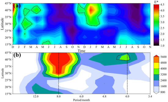 (a) Latitude–time variations of the spectral amplitude (units of 104 J/kg (1/m)−1). The area surrounded by the black dotted line in Figure 6a is the region with large values (>2.67 × 104 J/kg (1/m)−1). (b) Latitude–period variation of the spectral amplitude . The black dotted line represents the significant frequency spectrum intensity, which was calculated as the mean value of the frequency spectrum plus the standard deviation (3.1 × 103 J/kg (1/m)−1). The red dotted lines shown from left to right in Figure 6b represent cycles of 12 and 4.8 months.