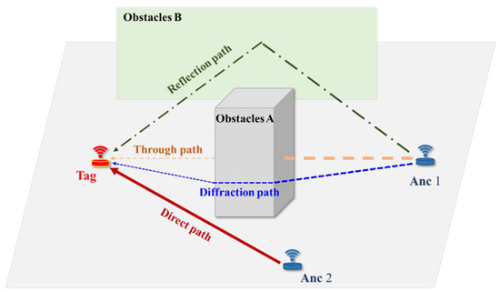 The ranging accuracy of UWB depends mainly on the accuracy of the signal time of flight (TOF). In an LOS environment, since there is no occlusion between the transceiver devices, the direct signal has the shortest distance and requires the least energy attenuation compared to the multipath signal, and the UWB has high ranging accuracy due to its own nanosecond narrow pulse characteristics. In an NLOS situation, the signal propagation path is more complex, as shown in Figure 1 for the anchor (Anc 1), and the direct path is blocked by spatial obstacles; the signal propagation path changes to transmission, reflection and diffraction, and the change of propagation medium or path causes the TOF ranging values to generate different degrees of positive errors [16].