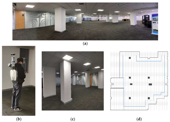 Today, with the promotion and application of LiDAR equipment, the collection and map building of indoor environments have become fast and accurate. In this paper, as shown in Figure 2a, in a typical indoor office scene of 812 m2 with a complex spatial structure, a LiDAR backpack device fusing a 16-line velodyne LiDAR and panoramic camera, as shown in Figure 2b, was selected for fast information collection, with the collection process taking about 1 min. Excluding the movable objects in the scene, such as chairs and cartons, the modeling software was able to quickly generate a simple two-dimensional plan of the fixed structure of the experimental site. As shown in Figure 2d, the black rectangle is the load-bearing column of the building with a minimum side length of 76 cm. The modeling error is between 3–5 cm when using a laser rangefinder with a ranging accuracy of ±2 mm for calibration.