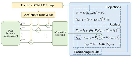 - Finally, the established LOS/NLOS information map anchors are combined with adaptive antidifference filtering to perform the online preferential positioning of anchors and measure the degree of anomalies of measured values. Furthermore, an adaptive extended Kalman filtering algorithm based on an LOS/NLOS information map is designed and the system performance is verified.