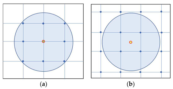 The grid on the anchor LOS/NLOS information map is a square with side length of 0.5 m and its diagonal length is about 0.707 m. Therefore, in the nearest neighbor fusion scheme, a circle is drawn with a radius of 0.71 m with the estimated point as the center, and the grid points contained in the circle are selected as the nearest neighbor points of the estimated point. As shown in Figure 5, the blue points are map grid points and the red points are localization position estimation points when the estimation points overlap with any grid point, as shown in Figure 5a, containing nine nearest neighbor points at this time, which is the situation that covers the maximum number of nearest neighbors. When the estimated point is located at the center point of the square grid, as shown in Figure 5b, it contains four nearest neighbors at this time, which is the situation that covers the least number of nearest neighbors. It can be seen that when using a circle with a radius of 0.71 m to set the nearest neighbor region, the interval of the number of nearest neighbor points n can be obtained as .