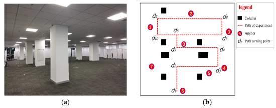 Experimental Site 1 shows an indoor environment, as shown in Figure 6a, with Figure 6b as the view from above. The anchors are located as red dots A0–A7 in the figure, the black squares are seven columns in the space and the presence of the columns has a severe NLOS impact on the positioning anchor. The experimental site has typical features of underground parking lots, subway stations and other such environments and is highly representative. The walking route in the experiment is shown in Figure 6b as a red dashed line, starting from the d1 position point, passing through points d2–d10 and finally ending at point d6. The whole route contains 10 straight lines and 9 right-angle bends, forming a closed circuit, and the total length is 71.5 m.