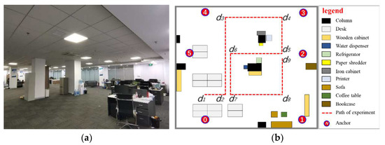Experimental Site 2 is the indoor environment shown in Figure 7a, with Figure 7b as the view from above. This scene is a typical indoor office environment. In addition to columns, it also has office desks, iron cabinets, refrigerators, printers, wooden cabinets and other facilities. The scenario is very complex, which is more likely to cause the multipath effect of signals. The anchors are located as shown by the red dots A0–A5 in the figure and the walking route in the experiment is shown in Figure 7b as a red dashed line, starting from the d1 position point and ending at point d9. The whole route contains 9 straight lines and 7 right-angle bends and the total length is 71.5 m.
