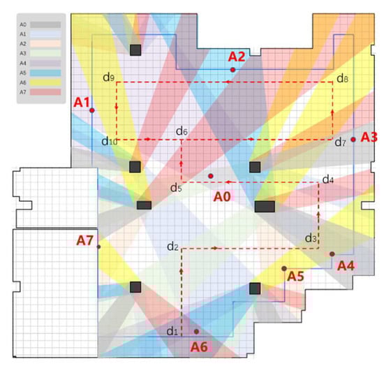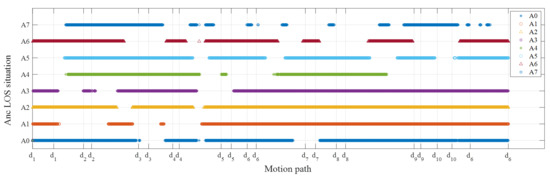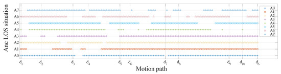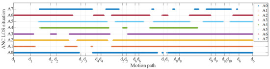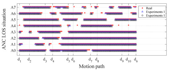 In terms of anchor selection, by comparing Figure 10, Figure 13 and Figure 19, it can be seen that the selection of the LOS anchors remains basically the same for different scenarios on the same route. For a more intuitive comparative analysis, this work normalized the epochs of the two experiments and compared them to Figure 10. As shown in Figure 21, the horizontal axis indicates the path segment passing from the motion start point d1 to the motion termination point d6, the vertical axis is the LOS situation of the eight anchors A0–A7 at the corresponding path locations and the red star is the actual situation of LOS anchors on the path, which remain consistent with that in Figure 10. The blue triangle is the selection of LOS anchors using the Experiment 1 algorithm, and the black circle is the selection of LOS anchors through the Experiment 2 algorithm. It can be seen that the two different scenarios are almost identical to the actual LOS anchor selection, with differences in individual points, and that the LOS selection is less than the actual situation, which is because the algorithm enacts the LOS/NLOS of the anchors within a certain range around the estimated point, so the actual number of LOS anchors obtained should be less than or equal to the real situation, as is the case of the results analyzed in Section 3 based on the anchor LOS/NLOS information map positioning algorithm. Statistically, the correlation coefficients of Experiment 1 and Experiment 2 with the actual LOS anchor selection are 92.96 and 92.87, respectively, and the usability of the designed algorithm for the selection of anchor is well verified by comparison.